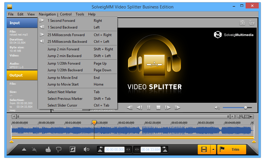 Meet SolveigMM Video Splitter - editor for MPEG-2, AVI, WMV, ASF, MP4, MKV, MOV, AVCHD, MP3, WMA files. The main functions of the program are the ability to quickly save or cut an arbitrary number of media fragments from a video / audio file, as well as merge media files. All operations are performed with preservation of the original quality and without loss of video / audio synchronization. The intuitive interface allows you to edit media files with a few mouse clicks, you can download SolveigMM Video Splitter below.