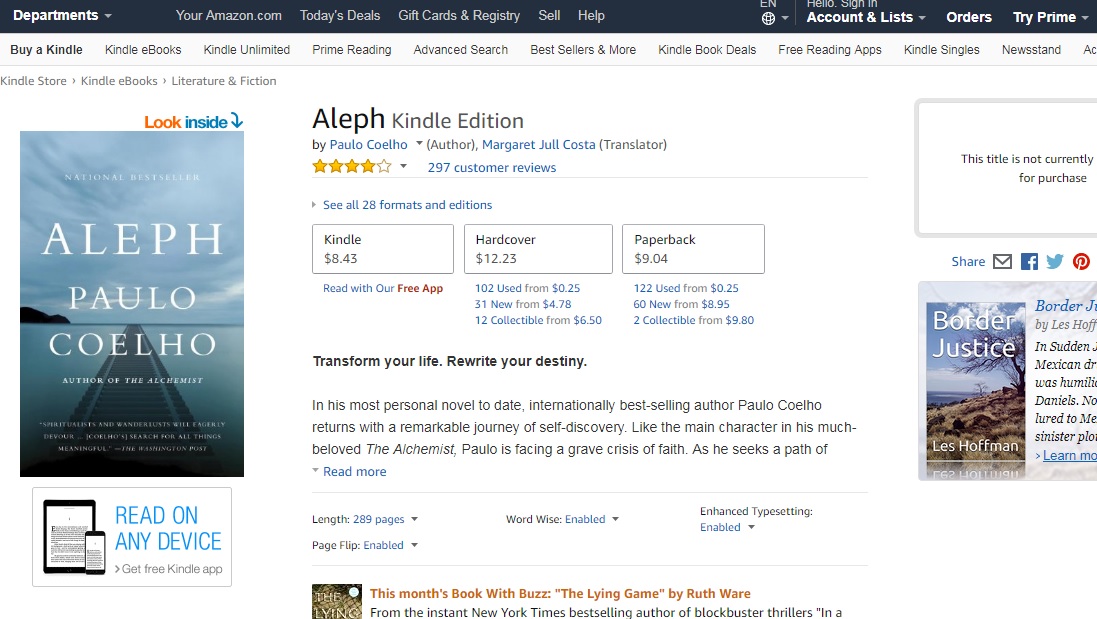 Setting off to Africa, and then to Europe and Asia via the Trans-Siberian Railway, he initiates a journey to revitalize his energy and passion. Even so, he never expects to meet Hilal. A gifted young violinist, she is the woman Paulo loved five hundred years beforeโand the woman he betrayed in an act of cowardice so far-reaching that it prevents him from finding real happiness in this life. Together they will initiate a mystical voyage through time and space, traveling a path that teaches love, forgiveness, and the courage to overcome lifeโs inevitable challenges. Beautiful and inspiring, Aleph invites us to consider the meaning of our own personal journeys: Are we where we want to be, doing what we want to do?