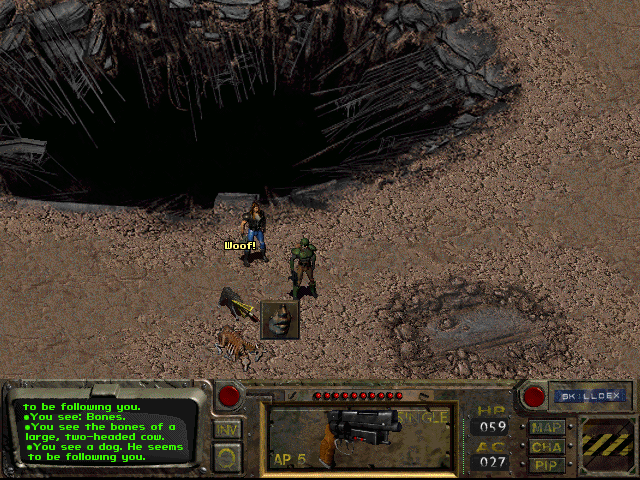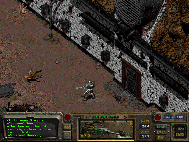The core of the game revolves around your character. Fallout uses a skill-based system to allow you to fine tune your character. As you gain experience (roughly half from combat, the other half from solving adventure seeds and non-combat events), your character will grow as you determine. Combat in Fallout is tactical turn-based. You can take as much time as you need to make decisions. Choose from different types of attacks, with a variety of weapons and attack skills.
