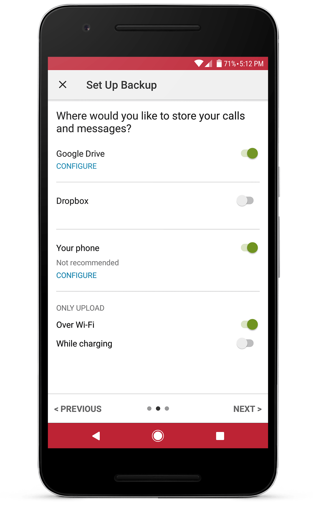 • Backup is created locally on the phone by default, but you have the option to upload to Google Drive, Dropbox, OneDrive or Email. You are responsible for backup files. At no time are the files sent to the developer.