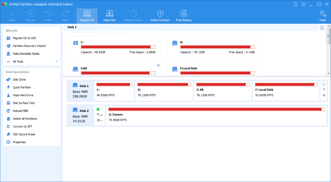 AOMEI Partition Manager enables you to extend the available space on hard disk quickly for improve the capacity for the original partition. The smart migration wizard could easily assist you to migrate OS to another hard disk including SSD and HDD. All thanks to the stable partition recovery wizard, the lost and deleted partition is not your problem any more. Creating bootable disk allows you to get access your hard disk even the original OS crashed.