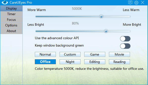 CareUEyes can automatically filter the blue light and make the screen look warmer and comfortable to the eyes, so that your eyes do not feel tired, and this application comes with several presets that adjust both color temperature and brightness such as normal, smart, office, game and night.