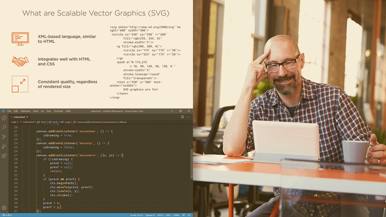 Humans are visual creatures and often look for ways to enhance our experiences with images and graphics. From understanding complex data sets via charts to getting the high score in the latest game, graphics are an important part of providing a positive experience for your users. In this course, Adding Graphics to Web Pages Using Canvas and SVG, you’ll learn to add custom graphics into web pages. First, you’ll explore how to create SVG documents and use them to create graphics that users can interact with. Next, you’ll discover what the canvas tag is and how it can also be used to allow users to create graphics using JavaScript APIs. Finally, you’ll learn how to choose whether SVGs or canvases are the best choice for the unique needs of your projects. When you’re finished with this course, you’ll have the skills and knowledge of web-based graphics needed to create rich and unique user experiences by adding custom graphics to your web pages.