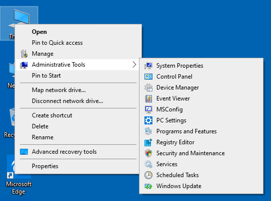 Administrative Tools Context Menu on This PC icon on Desktop having following entries"
