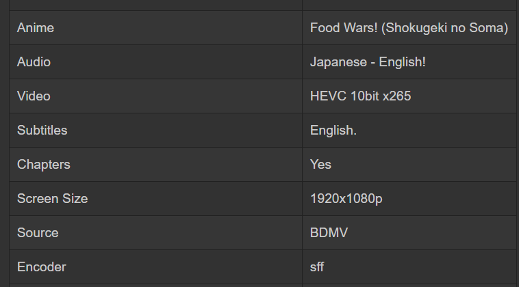 - [Anime Time] Food Wars! - 01 [BD][Dual Audio][1080p][HEVC 10bit x265][AAC].mkv (488.6 MB)