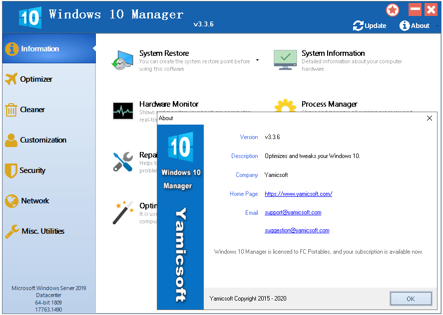 Yamicsoft Windows 10 Manager is a system utility that helps you optimize, tweak, repair and clean up Windows 10. It will increase your system speed, eliminate system fault, improve system security, and meet all of your expectations. Windows 10 Manager is a system utility that helps you optimize, tweak, repair and clean up Windows 10. It will increase your system speed, eliminate system fault, improve system security, and meet all of your expectations.