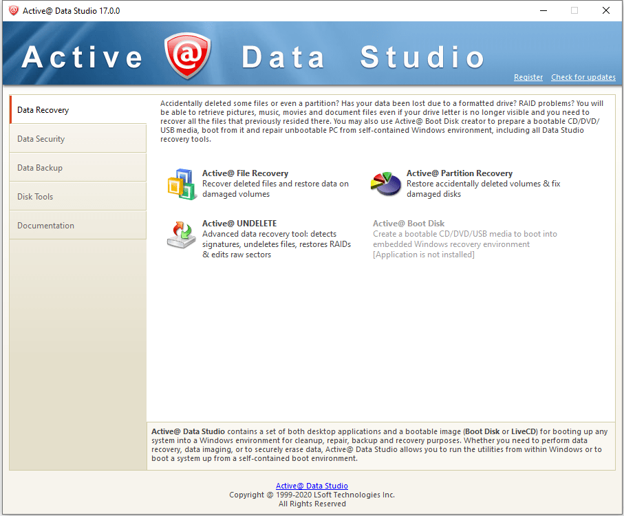 12 Disk Tools in One Package! Need to backup and restore your disks, recover deleted documents and photos, erase disks securely, monitor HDD health, or even repair PC when Windows can't start normally? Active@ Data Studio is a set of desktop applications and a bootable CD/DVD or USB Disk for booting up any system into a Windows Recovery Environment.