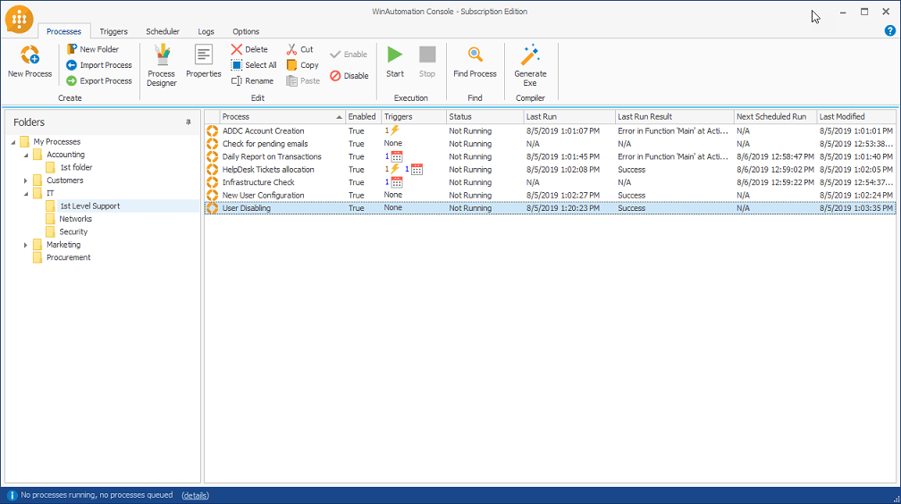Manage, review and control all aspects of your automations, Process properties and security settings through a single interface. WinAutomation gives users a vast range of options to customize the execution of processes to fit your working-style, whilst ensuring compliance with your organizations IT governance practices.