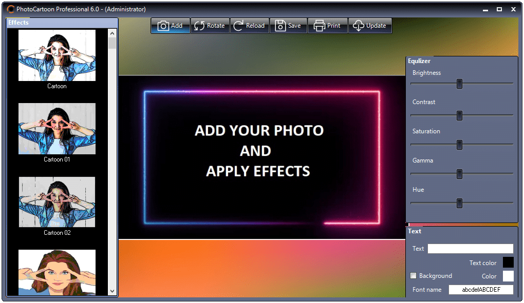 Photo Cartoon is a graphic editor whose main purpose is to provide a series of filters ready to help you transform your picture into a drawing, a cartoon or a painting. Its feature set is, however, not limited to a set of effects, as it also comes with a set of controls in the image equalizer that help you enhance the quality of the loaded photo.