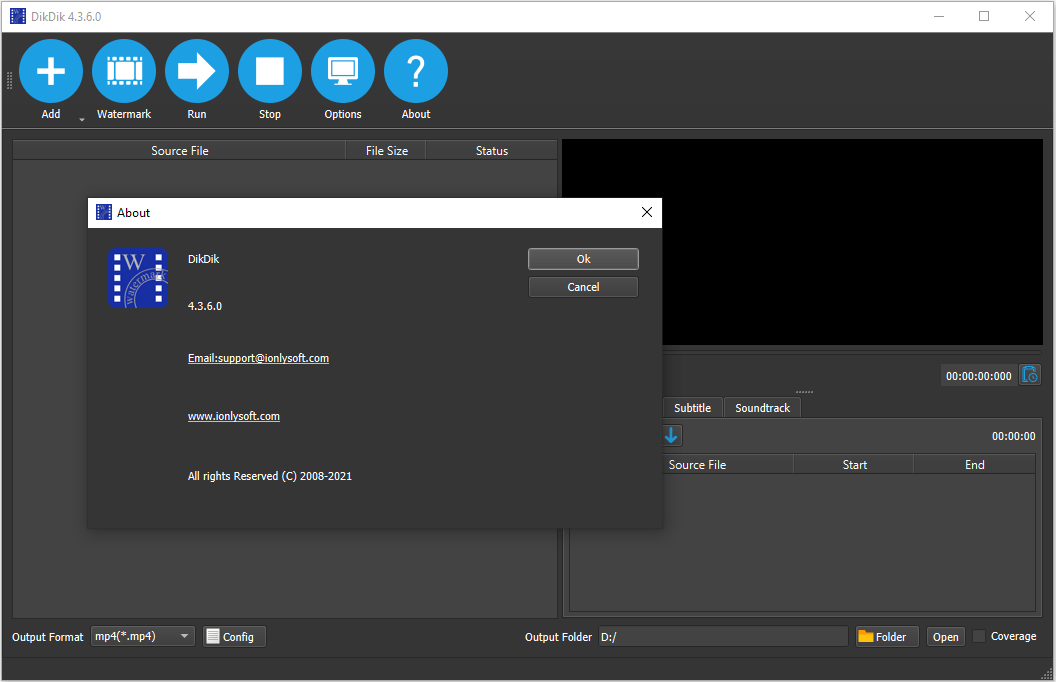 We're rebranding Video Watermark Subtitle Creator as DikDik. The software is an best video watermark software for editing video, adding watermark and subtitle, It can add video,audio, image, words and subtitle in WYSIWYG, and can set time of appearance, position, size and animated effects for watermark and subtitle to video, and preview at will. It can add watermark and subtitle to videos in batch, splitting and merging video in batch.