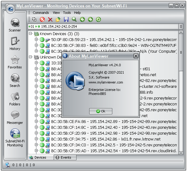 MyLanViewer Network/IP Scanner supports remote shutdown, wake-on-lan, lock workstation, log off, sleep, hibernate, reboot and power off. It is able to monitor IP address and show notifications when the states of some computers change. MyLanViewer Network/IP Scanner can also view and access shared folders, terminate user sessions, disable shared folders, show netstat information and detect rogue DHCP servers. The software can monitor all devices (even hidden) on your subnet, and show notifications when the new devices will be found (for example, to know who is connected to your WiFi router or wireless network). The program easy to install and use, and has a user-friendly and beautiful interface.
