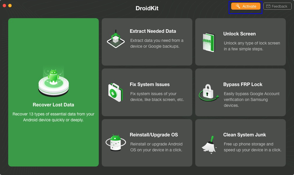 Lost your precious photos, important WhatsApp messages, or other valued data? Your phone got frozen, stuck on black screen, touch screen not working, or suffered another system issue? Forgot your lock screen password? Stopped by the FRP lock on your Samsung device? Don't panic. DroidKit is an all-round Android savior that can not only get lost data back to your phone, but also bring your dead phone back to life. Reliable as a pro, yet easy as pie.