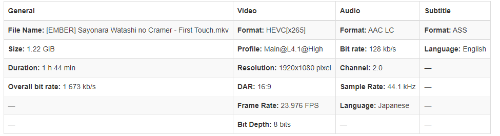 - [EMBER] Sayonara Watashi no Cramer - First Touch.mkv (1.2 GB)