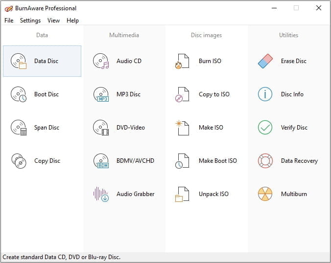 BurnAware Professional is a powerful CD, DVD and BD disc burning solution intended for users who need maximum control over every aspect of the burning process and use multiple burners for mass-production of various discs and quick creation of disc-to-disc copies. Itβs a solid piece of software that will help you cope with your daily burning tasks faster and more efficiently. The program enables users to create data discs (CD, DVD, Blu-Ray, bootable CD and DVD discs) and discs with multimedia content (Audio CD, MP3 discs and DVD video discs). Apart from this, BurnAware Pro will help you create and burn ISO images (ISO and CUE/BIN image files supported), erase rewritable discs, burn multisession discs and even extract specific files from disc sessions and tracks from Audio CDs. A simple and intuitive interface of the program will make even novices feel comfortable with the program features.