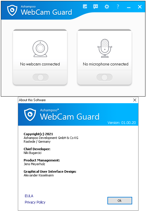 Ashampoo® WebCam Guard is super easy to use and instantly comprehensible. A single click disables/enables webcams and microphones-that's it! Additional settings, like auto-launch behavior or notifications, are available through the program options. Sounds simple? That's because it is! WebCam Guard is the simple and safe solution for more safety and privacy!