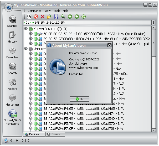 MyLanViewer Network/IP Scanner supports remote shutdown, wake-on-lan, lock workstation, log off, sleep, hibernate, reboot and power off. It is able to monitor IP address and show notifications when the states of some computers change. MyLanViewer Network/IP Scanner can also view and access shared folders, terminate user sessions, disable shared folders, show netstat information and detect rogue DHCP servers. The software can monitor all devices (even hidden) on your subnet, and show notifications when the new devices will be found (for example, to know who is connected to your WiFi router or wireless network). The program easy to install and use, and has a user-friendly and beautiful interface.