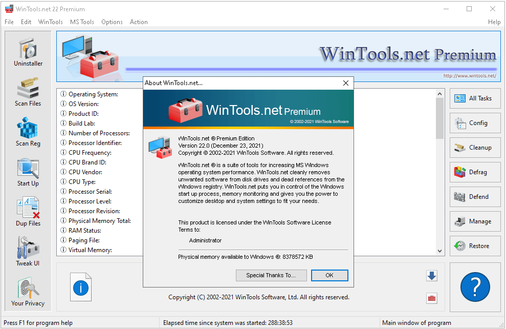 WinTools.net is a suite of tools for increasing MS Windows operating system performance. WinTools.net cleanly removes unwanted software from disk drives and dead references from the MS Windows registry. WinTools.net puts you in control of the Windows startup process, memory monitoring and gives you the power to customize desktop and system settings to fit your needs. Adds more speed and stability for your connection.