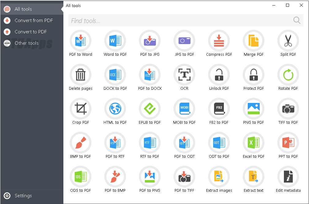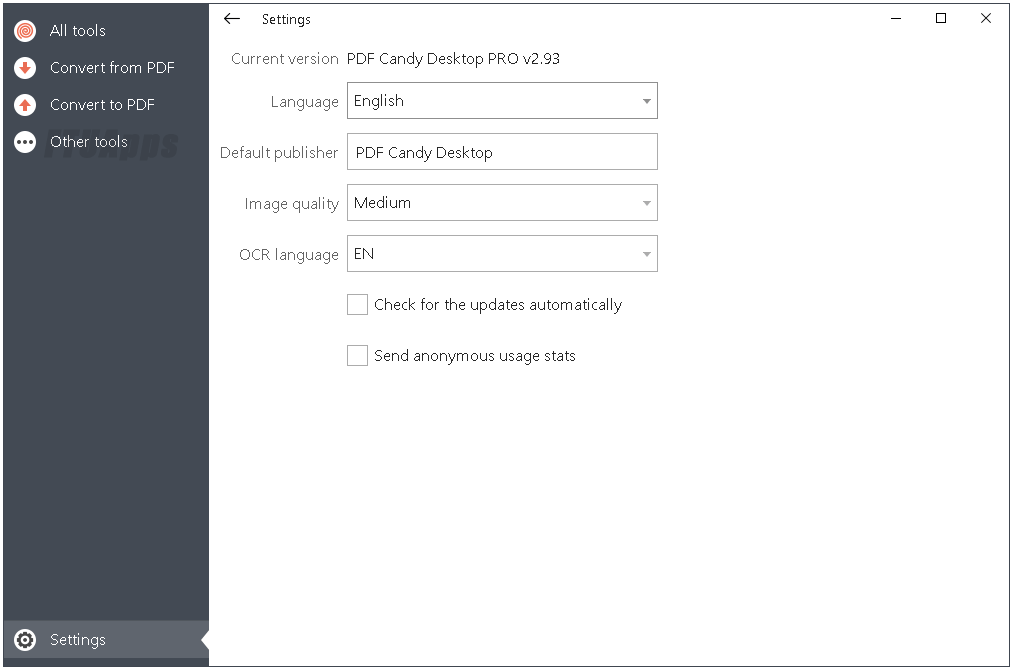 PDF Candy Desktop is a versatile tool that enables you to convert files from PDF to various supported formats (PDF to DOC, PDF to JPG, etc), convert documents, ebooks and images to PDF, merge PDF, split PDF, extract images and text from PDF, edit PDF metadata, protect PDF and unlock password-protected PDF files. Most modes support processing files in a bulk. All these features are available through modern and user-friendly interface.