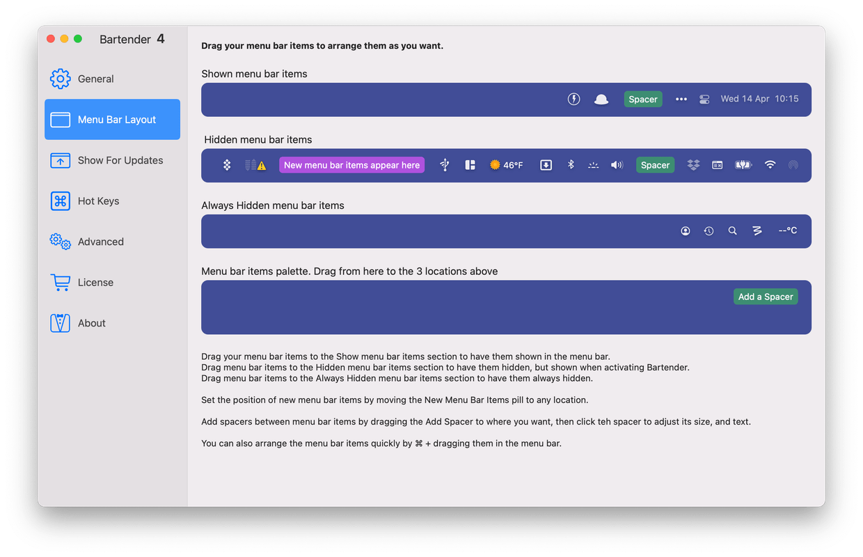 Bartender lets you organize your menu-bar apps by hiding them, rearranging them, or moving them to Bartender’s Bar. You can display the full menu bar, set options to have menu-bar items show in the menu bar when they have updated, or have them always visible in Bartender’s Bar.