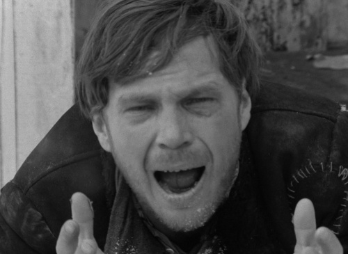 slips off the beam; the second time he can’t force the belt over his head—and we see an extended shot of his distorted, pained face. When he emerges from the outhouse, he is left staring dumb-faced out through the compound gate, through which a horse has just pulled a cart. We alternate between shots of his profoundly expressive face, with its mixture of pain, regret, and horror that is truly beyond words, and the landscape toward which he is looking. Shepitko finally takes us out toward where Rybak may not go: into the bleak wintry landscape that had opened her film.