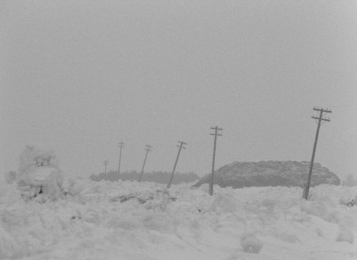 In this opening sequence Shepitko uses visual strategies that mark the film as a whole: landscape, faces, and the periodic breaking of the boundary between character and audience. Jagged streams of white ripple against a gray background, a saw-toothed band of white marks the right limit of the screen. Whistles of wind are interrupted by machine-gun fire. We see an Orthodox church in the distance and more blowing snow. There’s a slow montage of images: great crevasses of snow; a line of trees in the distance; telephone poles at awkward angles; and finally, a classic landscape of winter Russia—a row of birch and one lone oak with leaves still hanging on its branches. More whistling wind, machine guns, German voices. For a minute or more there are no human forms in this landscape—and then someone rises from the white, looks slowly about, and gestures for others to run for the woods’ protective cover. The sound of German voices is replaced by Schnittke’s score, a chorus of swelling voices that builds, wave-like, and into which is finally cut the sound that will become a hallmark of the film: humans laboring through heavy snow.