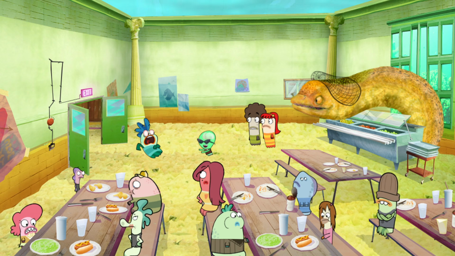 Fish Hooks is an animated comedy series that takes place inside a fish tank in a pet store called Budβs Pets. The show follows the adventures of three best friends: Milo, a fun-loving and impulsive fish; his neurotic brother Oscar; and their overachieving friend Bea, the only girl in the group. Together, they navigate the wild world of Freshwater High, a school located inside the tank, dealing with typical teenage problems like dating, fitting in, and surviving the social hierarchy - all while being fish in an aquarium. The series blends traditional animation with photo-collage backgrounds and features a colorful cast of aquatic characters including the school bully Jocktopus, the obsessive Clamantha, and many other quirky sea creatures.