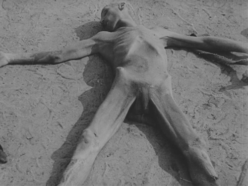 This compilation of tragic scenes in the film from a dozen camps indicates not only the wide range of Nazi techniques that reduced the camp populations but also furnishes details on the immense scope of the Nazi industrial system. Prisoners as slave labor kept the war industry functioning, while other inmates served as experimental subjects for medicine and science.