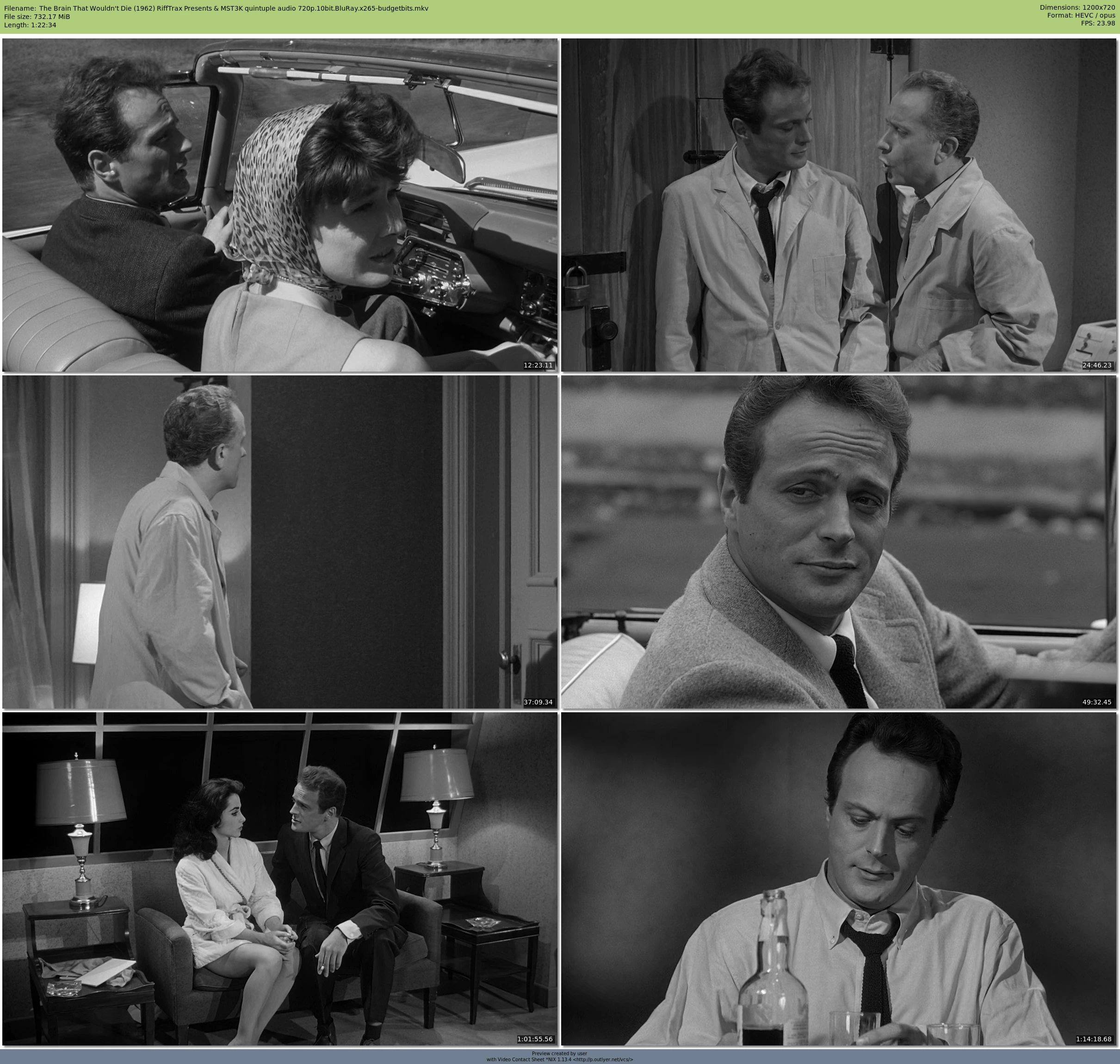 Video, normal audio, and official commentary track encoded by budgetbits from BluRay remux (The.Brain.That.Wouldn't.Die.1962.Uncut.1080p.Blu-ray.Remux.AVC.DTS-HD.MA.2.0-LEGi0N.mkv) with HandBrake 1.7.2, tweaked slower preset, x265, 720p, 10 bit, crf 25, nlmeans strong, sao/strong-intra-smoothing/rect disabled.