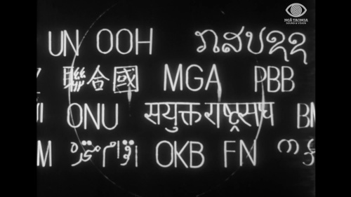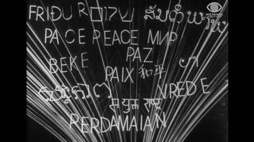 In 1959 the United Nations commissioned Lye to make this one-minute film, “Fountain of Hope,” to publicize United Nations Day (24th October). The film was screened worldwide in cinemas and on television. Lye superimposed the word for “peace” in many different languages over some of his kinetic sculptures, while a United Nations choir sang related music by Henry Brant that combined many national styles.