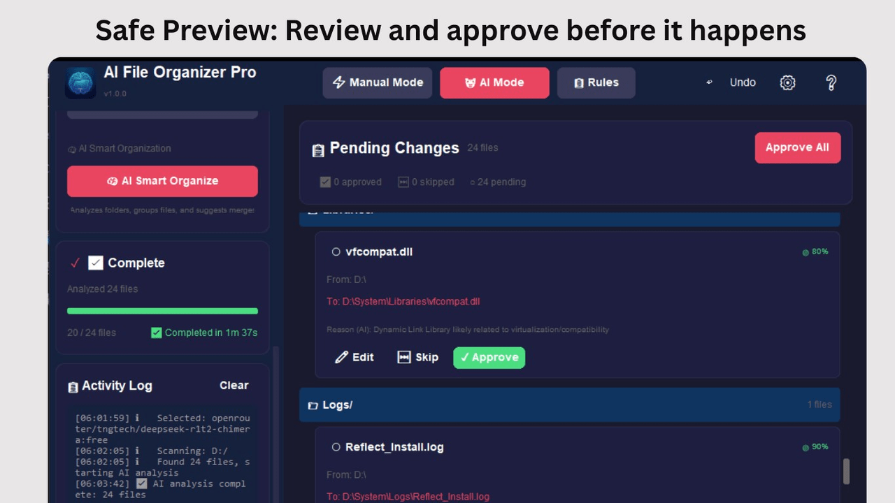 Always see exactly what will happen before any file is moved. Approve or reject changes with a side-by-side comparison view.
