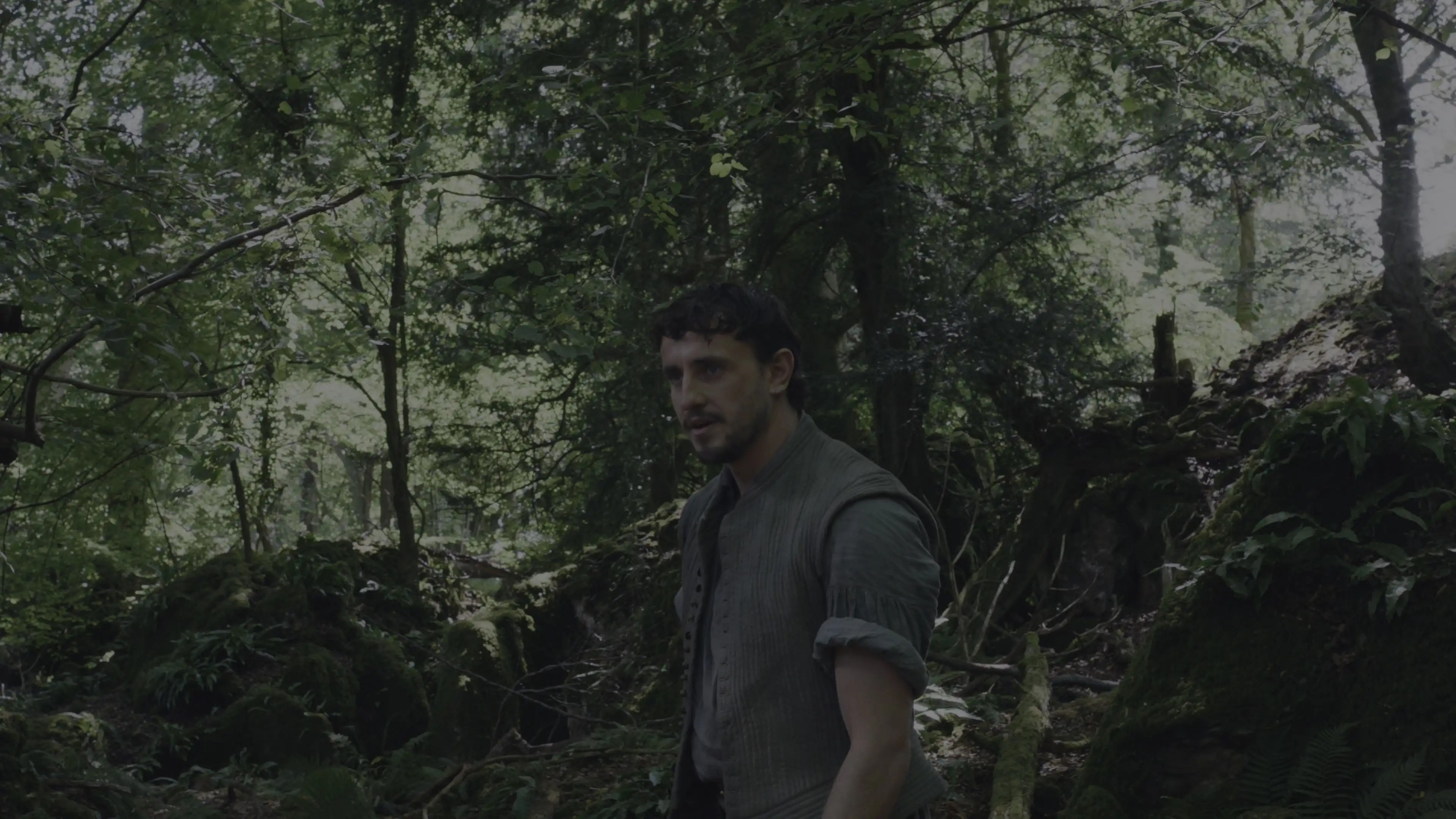 In un bosco, una giovane donna dorme rannicchiata nella culla formata dalla radice emersa